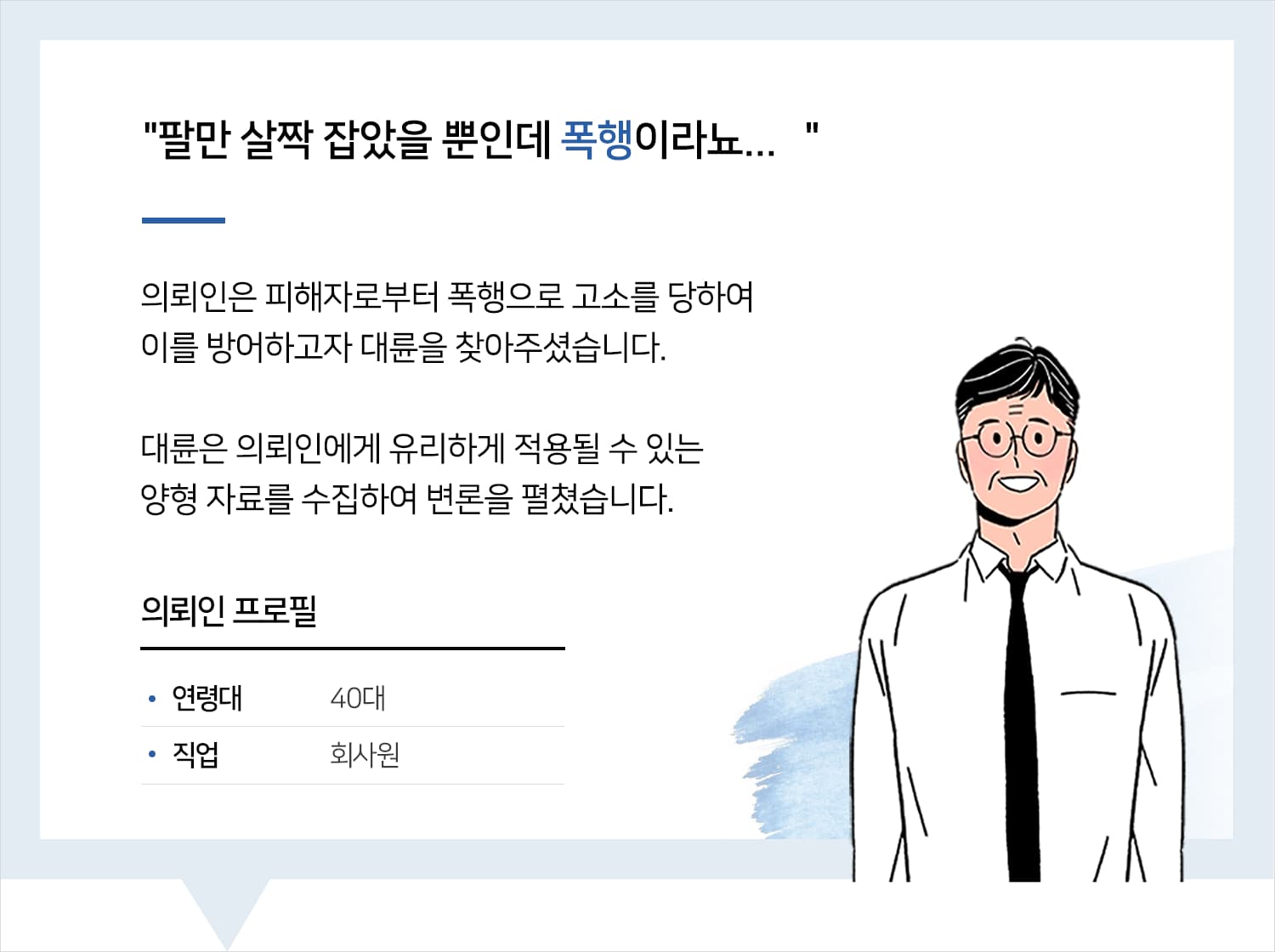의뢰인은 지나가던 행인과 언쟁을 벌이던 중 행인의 팔 부위를 잡는 폭행을 가했다는 혐의로 신고를 당했는데요.