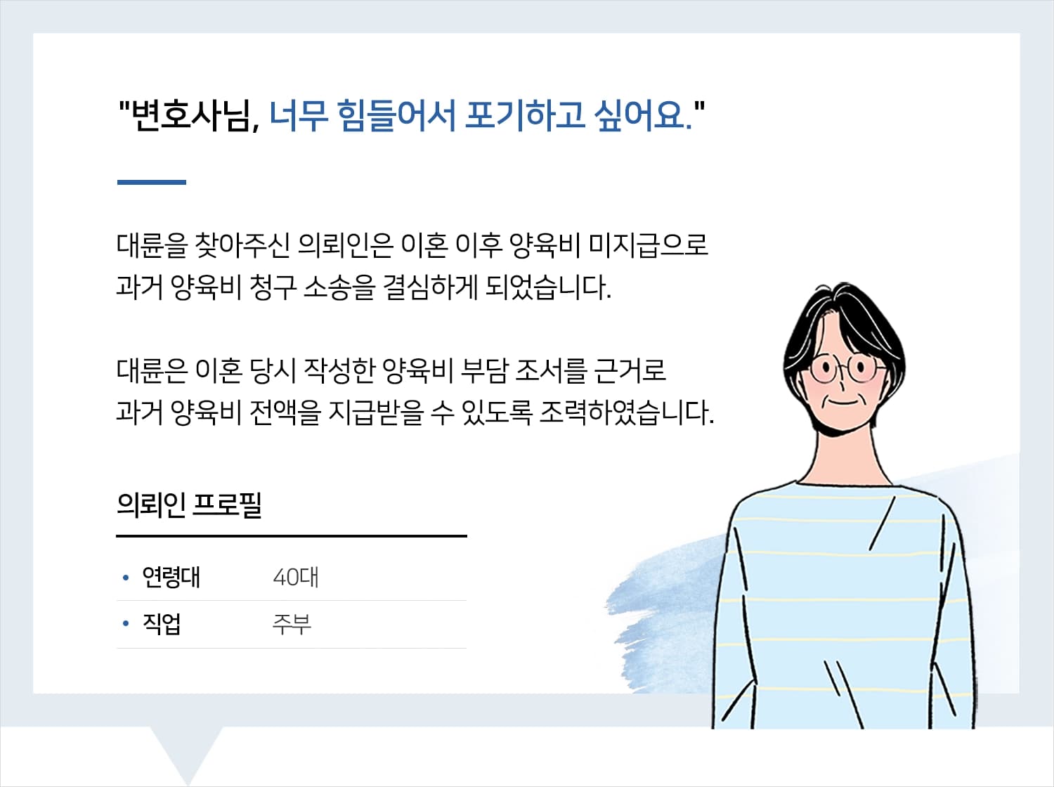 양육비의 부담을 느끼던 의뢰인은 C 씨를 상대로 과거양육비를 청구하기 위해 부천가사전문변호사에게 조력을 요청해 주셨습니다.