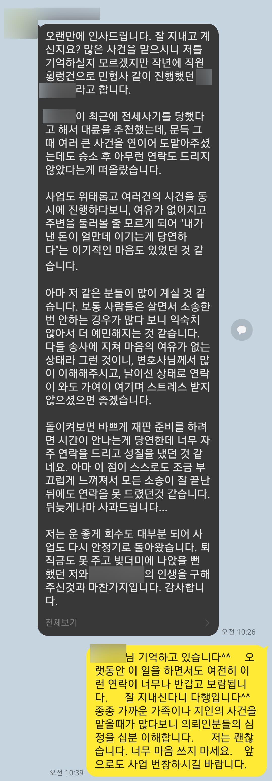 아마 저 같은 분들이 많이 계실 것 같습니다. 보통 사람들은 살면서 소송한번 안하는 경우가 많다 보니 익숙치 않아서 더 예민해지는 것 같습니다. 다들 송사에 지쳐 마음의 여유가 없는 상태라 그런 것이니, 변호사님께서 많이 이해해주시고, 날이선 상태로 연락이 와도 가여이 여기며 스트레스 받지 않으셨으면 좋겠습니다.