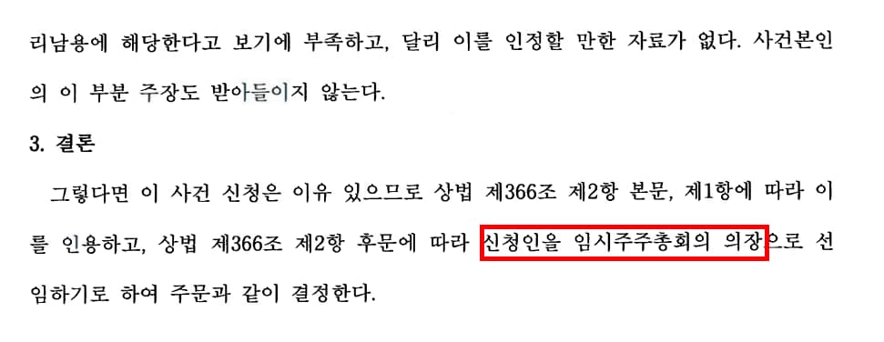 둘째, 임시주주총회 청구는 경영을 방해하고 대표이사를 압박하기 위한 권리남용이라는 논리였습니다.